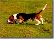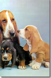 mayor similitud con el de los Terriers, buscando Esta diferencia se debe a que todos los Bassets de pelo liso, son descendientes directos del Perro de San Huberto, un sabueso con excelente olfato, el cual, siendo originario de la región de las Ardenas, debía ser de pelo corto para su buen desempeño entre los bosques y altos pastos. Actualmente, el pelaje del Basset Hound debe ser liso, corto y apretado, aunque no es demasiado fino. Su manto comparte la misma brillantez que el de un caballo de carreras, y a pesar de que en la antigüedad el tricolor (negro, fuego y blanco) era considerado como el auténtico heredero del San Huberto, hoy en día cualquiera de los colores reconocidos en los sabuesos es aceptable. |