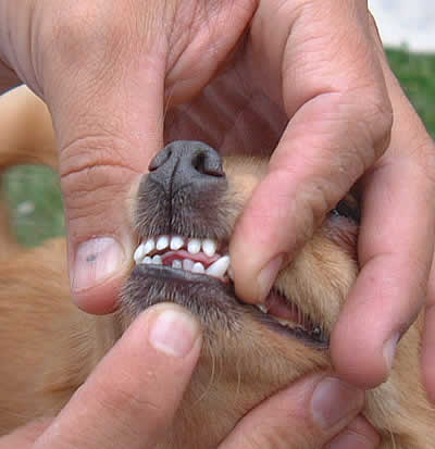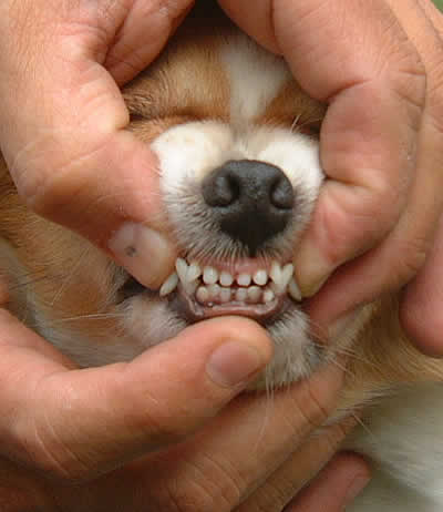 Mandíbulas / Dientes : Con mordida de tijera o nivelada (en forma de pinza); el prognatismo superior o inferior son seriamente penalizados, así como cualquier deformación maxilar o mandibular. |