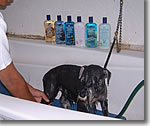 Puede usted poner una toalla sobre la mesa si como en el cepillado ha enseñado a que su perro se recueste sobre ella mientras es atendido. Esta le ayudara también absorbiendo humedad. Terminado el primer lado retire la toalla de la mesa y proceda secar el otro lado.